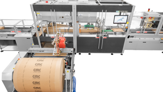 CMC PaperPro 針對物流包裝的降塑環(huán)保要求所設計,將CMC 長達三十年的紙包經(jīng)驗應用于B2C 的紙基類材料的包裝,根據(jù)包裝物品尺寸進行可變長度噴膠裁切包裝。紙基類材料為牛皮紙或紙泡軟紙板, 后者提供與氣泡袋相同的保護性。